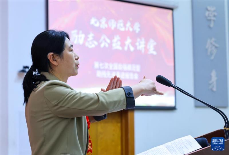 5月18日,清华大学听障学生李尧在现场进行宣讲。新华社记者 殷刚 摄
