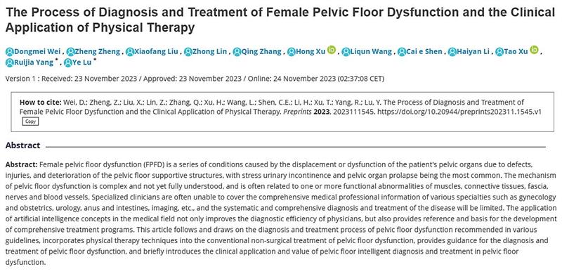 随着对女性盆底功能障碍(FPFD)认知的深入和科技进步,越来越多先进技术应用于疾病诊疗当中,为进一步提升盆底疾病管理水平带来了很大的进步。目前,由南京麦澜德医疗科技股份有限公司携手国内多位盆底领域专家对女性盆底功能障碍性疾病及物理治疗方面的最新研究结果和技术成果进行了汇总整理,共同撰写的文章《女性盆底功能障碍性疾病诊治流程及物理治疗技术临床应用》(The Process of Diagnosis and Treatment of Female Pelvic Floor Dysfunction and the Clinical Application of Physical Therapy)成功在预印平台Pre prints.org收录并发布,文章同时在Clinical and Experimental Obstetrics & Gynecology杂志处于同行评议阶段,原文链接:https://www.preprints.org/manuscript/202311.1545/v1。