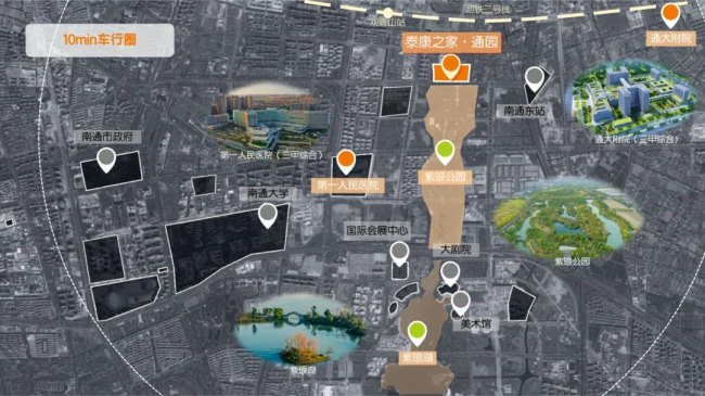 通园社区周边拥有全市最优质的三甲医疗资源,南通市区唯二的两家三甲综合医院均在项目5公里范围内,距南通市第一人民医院2公里,车行仅5分钟,与南通大学附属医院在建新院区相距也不到5公里。此外,区域商业配套紫琅生活汇距泰康之家·通园仅500米,地铁2号线观音山站相距约800米,项目3公里范围内还有紫琅新天地、南通金鹰世界(在建)等城市地标级商业。