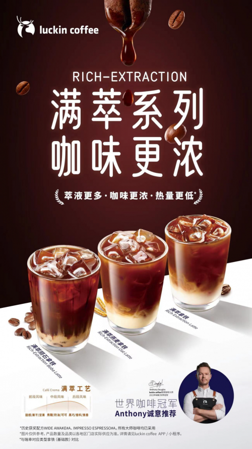 4月22日,瑞幸咖啡全新推出三款满萃工艺系列新品,包括满萃拿铁、满萃燕麦拿铁和满萃陨石拿铁。该系列新品通过全新的萃取工艺,以更深层次的浓醇口感,为消费者带来了更加多元化、高品质的咖啡体验。