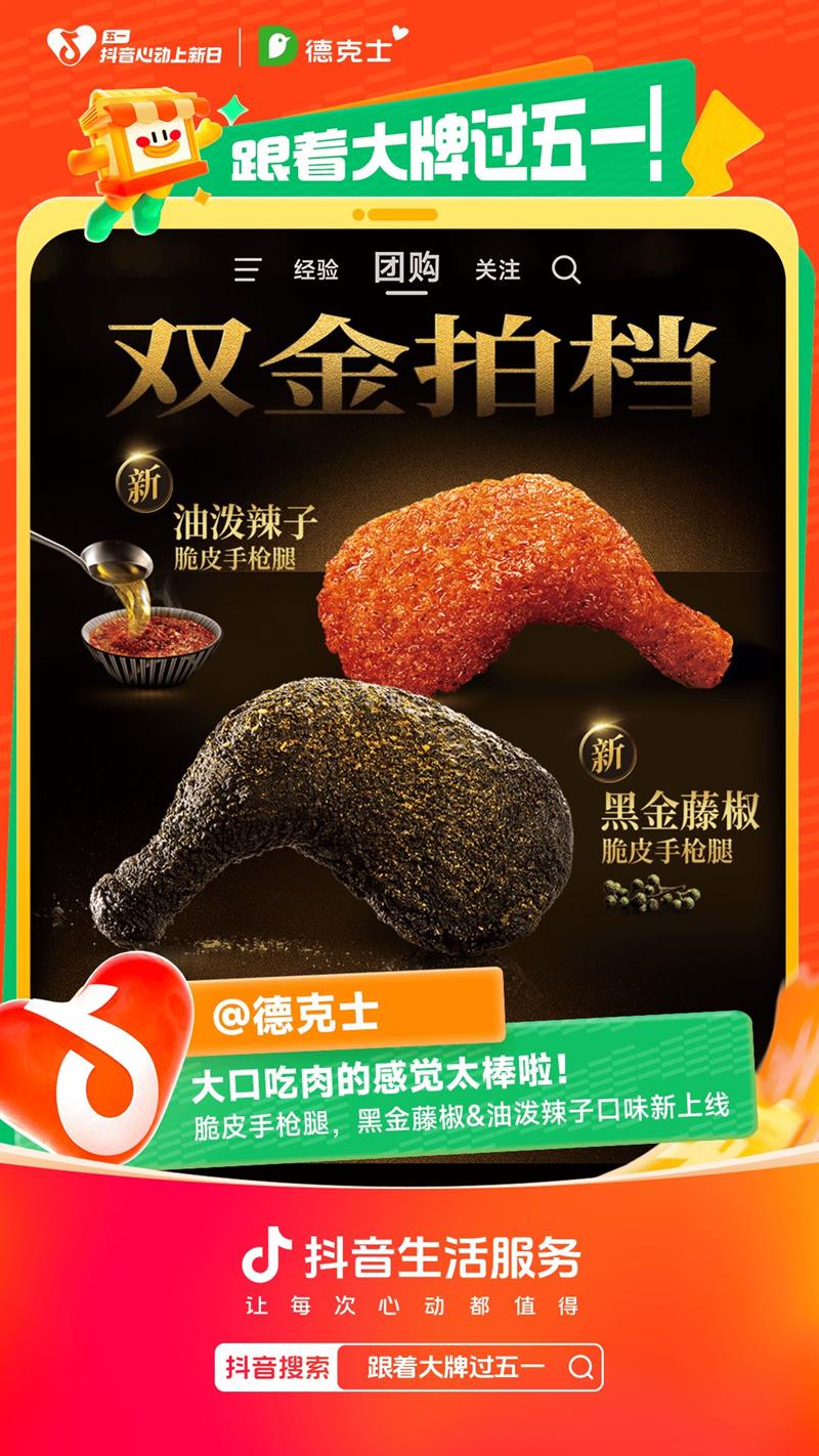 即日起至5月5日,打开抖音搜索「抖音心动上新日」,就能直接进入活动主会场,轻松享受抖音专属套餐,黑金藤椒、油泼辣子脆皮手枪腿2种新口味放开吃,同时参与完成集卡任务,还有机会解锁惊喜好礼,超多大奖就等你来!