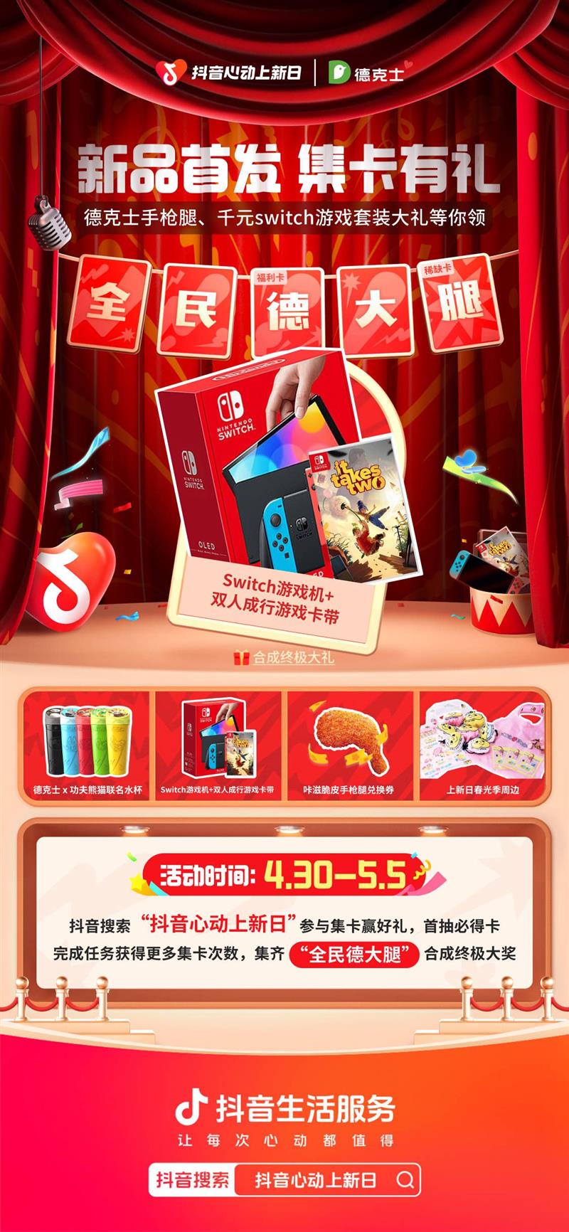 为了更好的满足大家“放肆”吃喝玩乐的新期待,抖音生活服务超级IP「抖音心动上新日」联动德克士,在抖音首发上新“双金拍档”脆皮手枪腿,特别打造“新品首发 集卡有礼”会场,发起“全民‘德’大腿”集卡赢千元大奖活动,并联合奉上价值千元的switch游戏大礼包等惊喜礼品,这次不止能吃得“省薪”,还能和游戏搭子们在假期玩个“开新”。德克士的超值加码,为大家的假期欢闹,再加一把火。