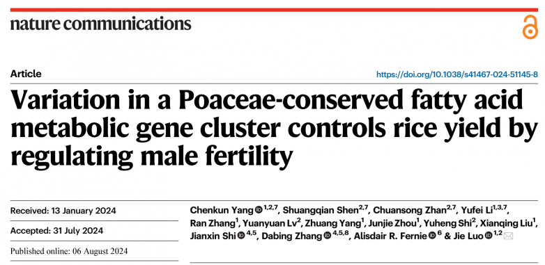 2024年8月6日,nature communicaitons在线发表了海南大学罗杰教授团队利用重测序、广泛靶向代谢组技术手段,确定了真核脂肪酸和植物初级代谢基因簇(参与合成和运输)通过调节花药育性来控制水稻产量。进一步分析了这一初级代谢基因簇的调控及其进化机制,为禾科作物的生态适应和杂交育种提供依据和遗传资源。