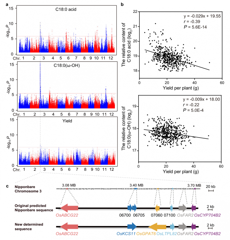 为了评估水稻的脂质变异,从全球533种水稻(Oryza sativa)中收集了糙米样本,并使用广泛靶向代谢组学分析策略对脂质代谢物进行了高通量定量分析,共鉴定到267种脂质代谢物。结果表明游离脂肪酸(FFAs)和羟基脂肪酸(HFAs)几乎都在粳稻品种中富集。代谢全基因组关联研究(mGWAS)显示,3号染色体上3.6 Mb的一个主要位点由这些脂肪酸定位(Fig. 1a)。有趣的是,表型全基因组关联研究(pGWAS)揭示了这个位点与水稻单株产量(图1a)和小穗育性共定位。进一步分析揭示了脂肪酸含量与单株产量之间的强相关性(图1b)。结合脂肪酸的代谢途径和该位点的基因注释,鉴定出5个主要候选基因(图1c)。此外在该位点发现了两个注释基因。
