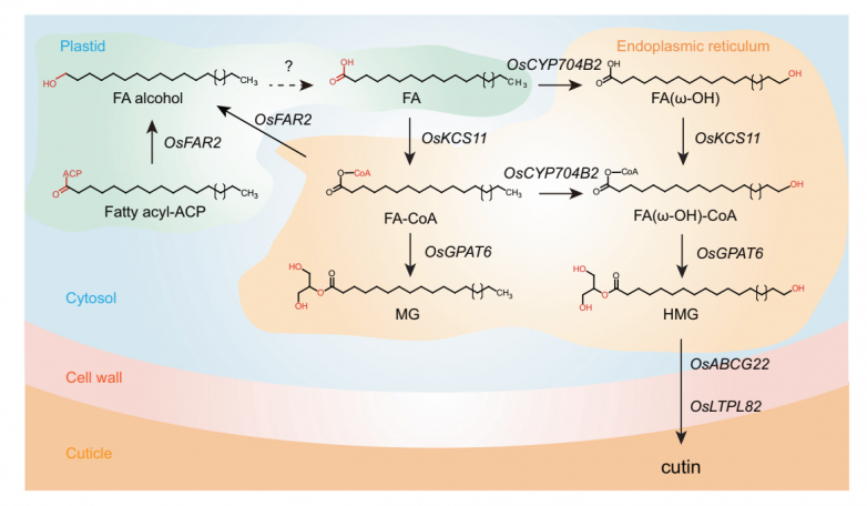 角质素单体生物合成途径的模型:重新合成和酯化的脂肪酰基ACPs首先被OsFAR2在质体中还原为脂肪醇,然后通过未知基因产生脂肪酸,然后扩散到内质网(ER)。角质素单体HMGs随后可在内质网中通过OsCYP704B2-OsKCS11-OsGPAT6或OsKCS11OsCYP704B2-OsGPAT6两种主要合成途径中的任何一种,通过OsABCG22和OsLTPL82将其转运到细胞壁的外质体表皮,在此沉积角质素。黑色箭头表示本文中验证的步骤,虚线箭头表示未知步骤。