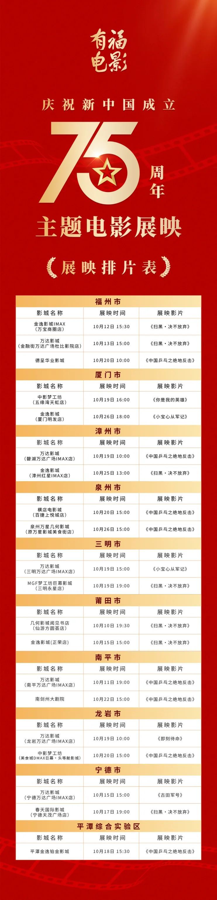 由福建省电影局、中共福州市委宣传部主办,福建省电影发行放映有限公司、福州电影节有限公司承办的“有福电影”庆祝新中国成立75周年主题电影展映正式开启。《中国乒乓之绝地反击》《你是我的英雄》《扫黑·决不放弃》《古田军号》《即刻待命》《小宝心从军记》等多部福建出品的电影于2024年10月在全省九市一区20家影院进行公益展映。