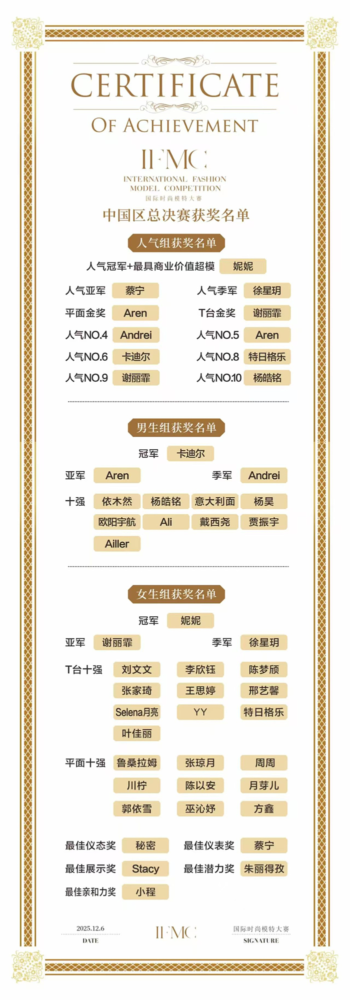 赛事的尾声,所有参赛选手携手登台,共同完成了温馨的大谢幕仪式。他们面带微笑,挥手致意,用自信的姿态定格下这场时尚盛宴的圆满瞬间。2025 IFMC国际时尚模特大赛中国区总决赛的落幕,不仅为时尚行业输送了一批极具潜力的新锐模特,更推动了中国时尚产业与国际潮流的深度融合。未来,IFMC国际时尚模特大赛将继续深耕模特人才培养领域,为时尚行业的蓬勃发展注入源源不断的新生力量。(通讯员:谢曦玥)