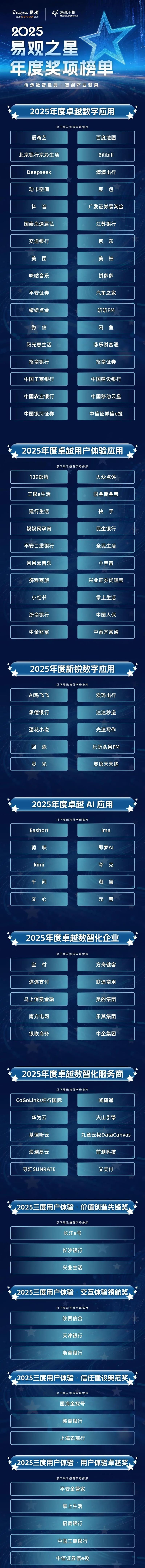 2025年“易观之星”奖项设置覆盖“数智产品”、“数智金融用户体验专项”及“数智企业”三大系列,共十大类别。这一体系不仅传承了对卓越数字应用与转型企业的发掘,更首次系统性设立“金融用户体验”专项,并强化了“年度卓越AI应用”奖项,精准回应了产业从“数字化”迈向“数智化”深水区的核心关切。