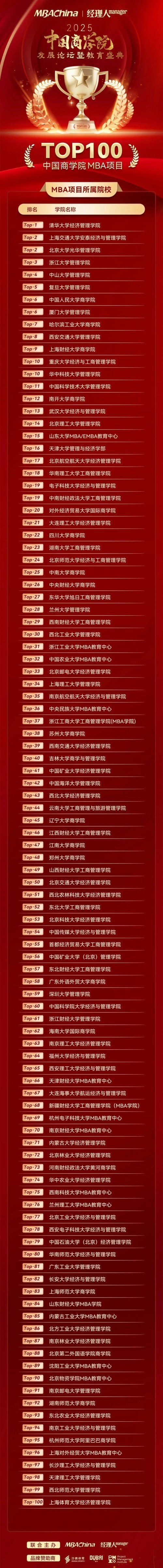 附1:2025年度中国商学院MBA项目TOP100榜单如下: