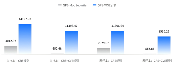 基准测试显示:在相同环境(Intel i5-10400, 32GB内存)下,WGE的每秒请求处理能力(QPS)达到ModSecurity的4.3倍以上(ModSecurity约4,010 QPS vs. WGE约17,560 QPS)。在面对海量规则与复杂攻击的混合场景时,其专项优化版本更能实现5~20倍的性能提升。