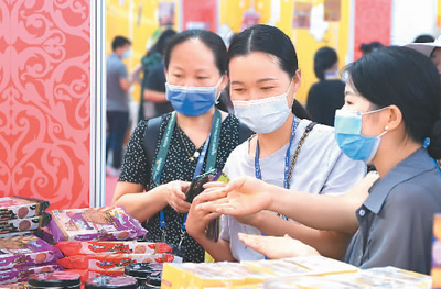 在第18届中国—东盟博览会上,各国参展商带来的特色商品受到热捧。图为9月11日,参会者在挑选马来西亚商品。 |