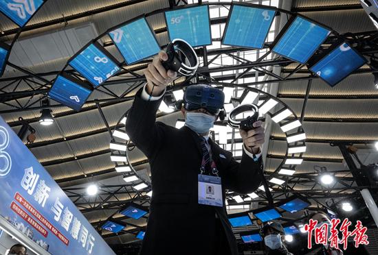 11月24日,浙江桐乡乌镇,“互联网之光”博览会上,一名参会者尝试用VR做化学实验,体验5G智慧教育。