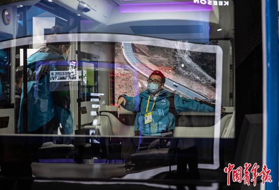 11月23日,浙江桐乡乌镇,“互联网之光”博览会上,两名记者坐进L4级无人驾驶小巴“蓝胖胖”里拍摄视频。