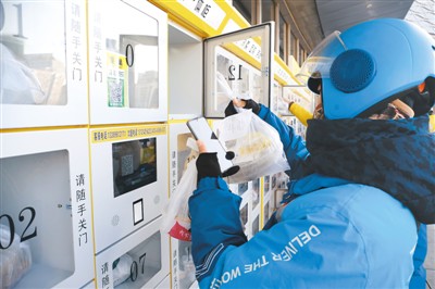 图为在沈阳,外卖小哥正把餐食放入外卖智能取餐柜。