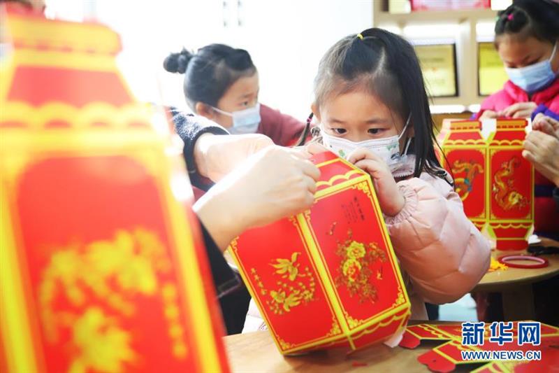 2月23日,山东省青岛西海岸新区珠山路社区的小朋友在社区党群服务驿站做灯笼。新华社发(王培珂 摄)