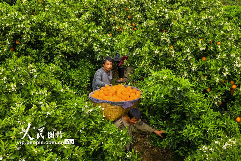 2021年4月19日,三峡库区湖北省宜昌市秭归县郭家坝镇烟灯堡村的村民正在采摘“伦晚”春橙。郑坤摄(人民图片网)