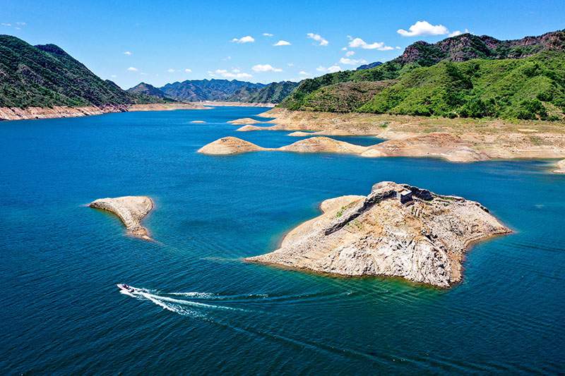 6月3日,船只停靠在喜峰口西潘家口段长城脚下运输维修所需砖石(无人机照片)。