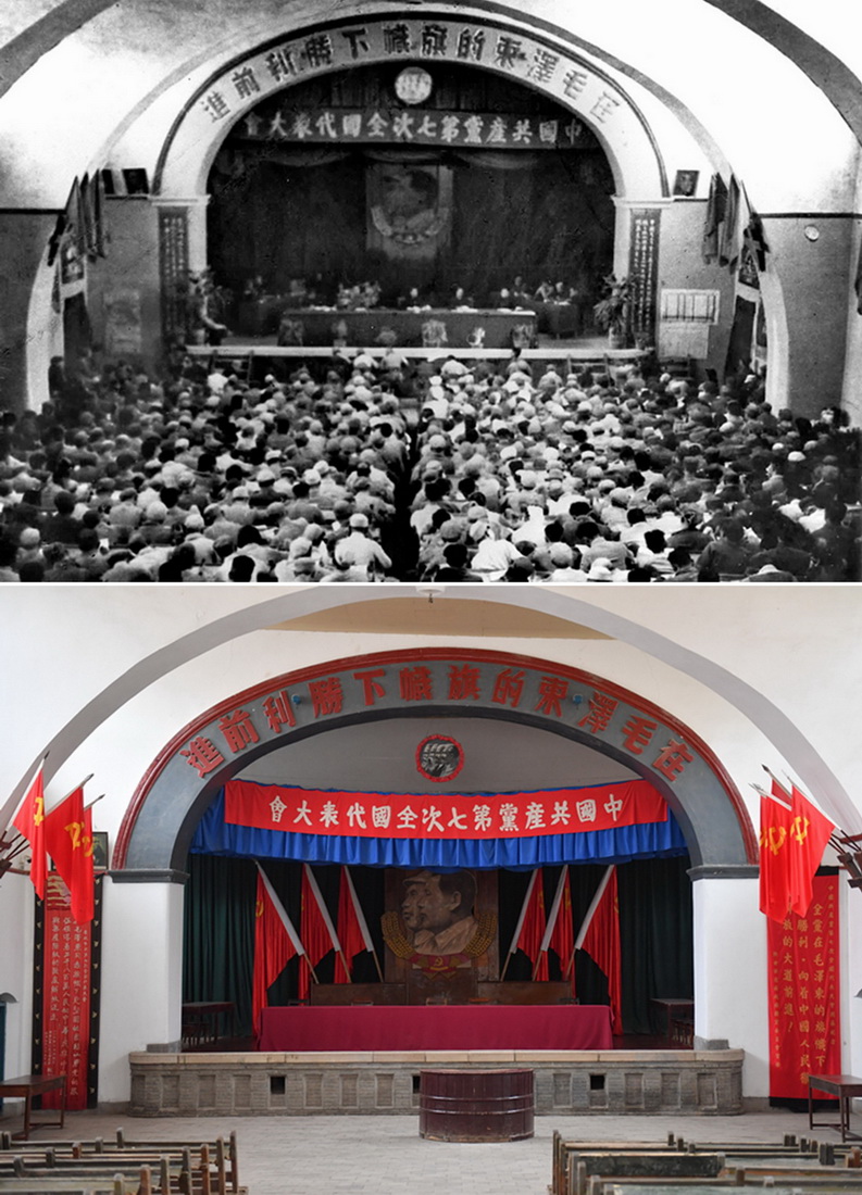 拼版照片:上图是中共七大会场(资料照片),下图是2021年3月31日拍摄的位于延安市杨家岭革命旧址的中共七大会场(新华社记者 张博文 摄)。新华社发