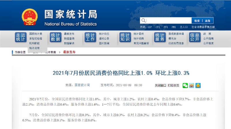 2021年7月份,全国居民消费价格同比上涨1.0%。其中,城市上涨1.2%,农村上涨0.4%;食品价格下降3.7%,非食品价格上涨2.1%;消费品价格上涨0.6%,服务价格上涨1.6%。1-7月平均,全国居民消费价格比去年同期上涨0.6%。