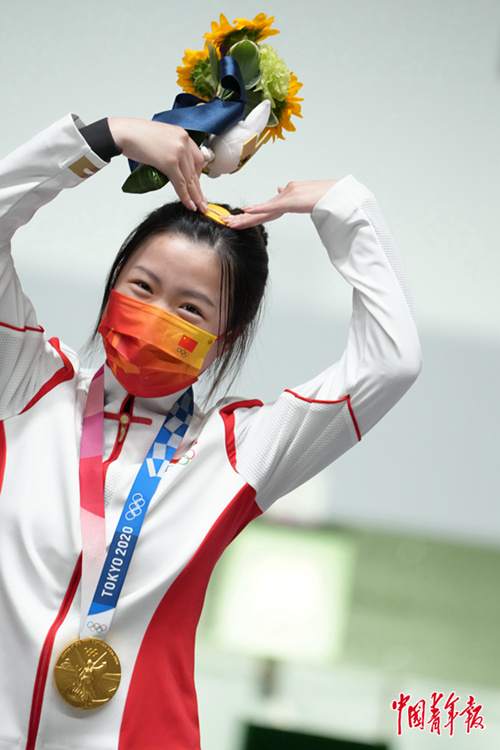 为中国奥运代表团夺得首金的杨倩,在领奖台上可爱比心。 中青报·中青网记者 刘占坤/摄