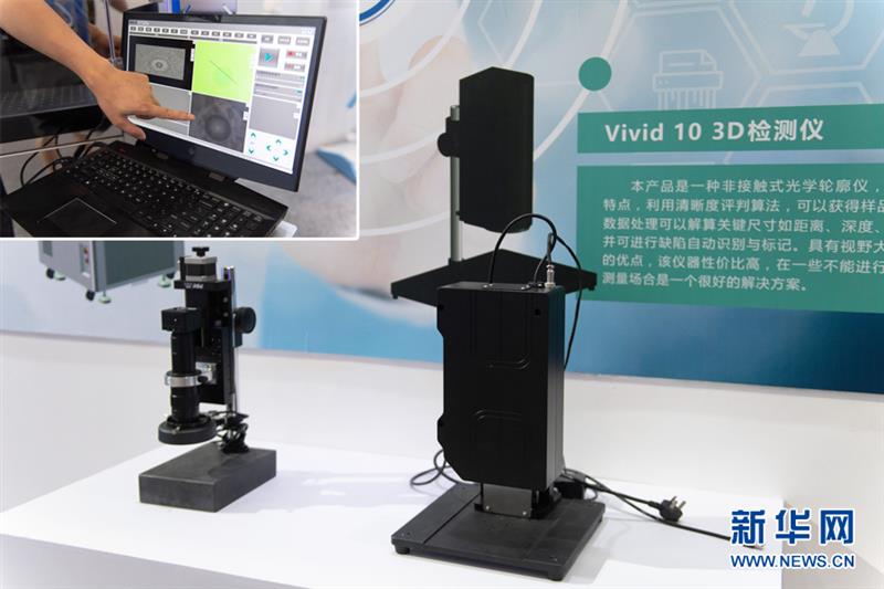 图为中国科学院重庆绿色智能研究院展出的一款3D检测仪产品,左上方为工作人员展示3D检测仪的功能界面。新华网 耿骏宇 摄