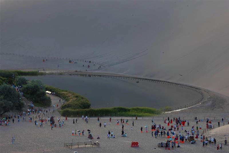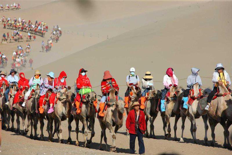 月牙泉边、鸣沙山上骑骆驼的游客。新华社记者刘诗平 摄