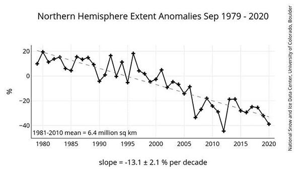 (北极海冰监测,2020年9月北极海冰范围异常偏小,北极海冰达历史第二少)