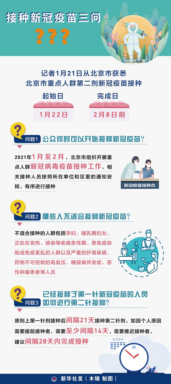新华社北京1月21日电(记者侠克)记者21日从北京市获悉,北京市重点人群第二剂新冠疫苗接种起始日为1月22日,计划在2月8日前完成。截至2021年1月19日,北京市已完成重点人群第一剂疫苗接种,累计接种人数超过190万。
