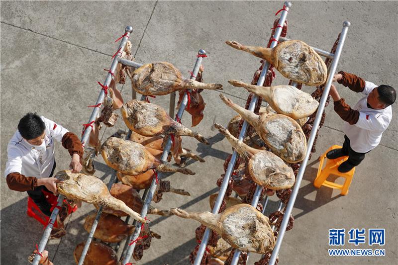 随着春节临近,安徽省黄山市徽州区西溪南镇村民开始制作徽州传统腊味,腌制火腿、腊肉,灌制香肠,并进行晾晒。腊味飘香,年味渐浓,制作、晾晒传统腊味成为徽州一道独特风景。新华网发(施亚磊 摄)