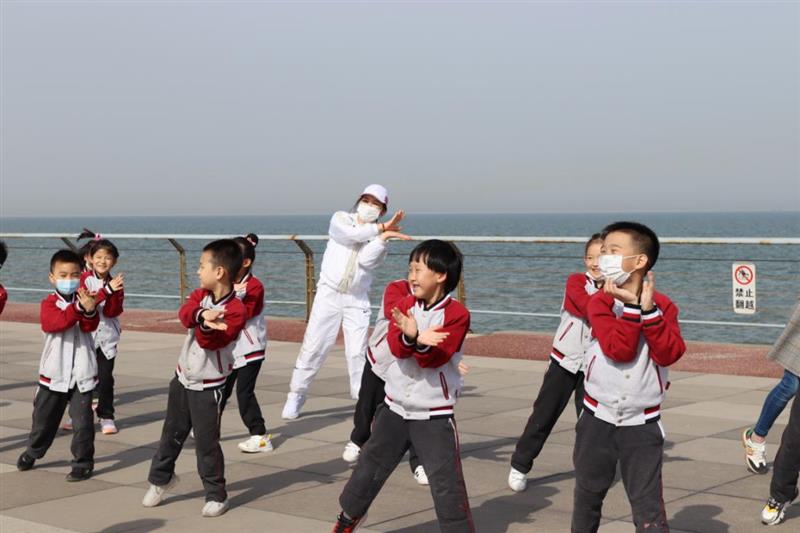结束了海洋馆的探索之旅,孩子们意犹未尽,又一起来到东疆港踏青感受温柔的海风,驻足广阔无垠的大海,海洋环保知识在这里又一次得以内化。在各组负责人的带领下进行了“鲨鱼一家、小企鹅跃圈圈、海马跳、奔跑企鹅”趣味游戏项目活动,在孩子们欢歌笑语中结束了一天的研学活动。