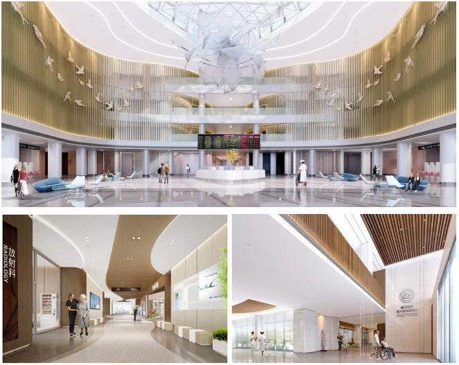 项目整体风格简洁明快、轻松舒适,将“依山傍水、生命绿洲”的设计理念融入到整体空间设计中,并结合建筑“生命之环”的设计理念,延续建筑曲线的设计手法,达到建筑室内一体化效果,通过木色的格栅延伸至医疗主街的设计手法,让空间更有连续性和统一性。通过提取当地文化和自然景观的特色,对山脉的自然形态进行研究,将曲线元素融入到室内空间的装修设计中,吸取自然环境中的颜色,延伸出医院中的主要配色体系。