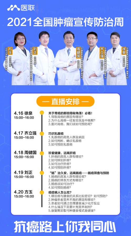中国医学科学院肿瘤医院肿瘤内科主任医师胡兴胜、中国医学科学院肿瘤医院肿瘤内科主任医师秦燕、云南省肿瘤医院结直肠外科副主任医师刘萍、天津医科大学肿瘤医院胰腺肿瘤科副主任医师王秀超、天津医科大学肿瘤医院消化科副主任医师刘锐、陕西省中医医院肿瘤内科主治医师李琳婵、北京大学肿瘤医院消化内科主治医师齐长松均参与到了义诊活动中。今天起至4月20日,中国医学科学院肿瘤医院肝胆外科主任医师周健国、中国医学科学院肿瘤医院结直肠外科主任医师刘正、中国医学科学院肿瘤医院胰胃外科副主任医师徐泉、中国医学科学院肿瘤医院乳腺外科副主任医师齐立强及北京大学肿瘤医院营养科副主任医师方玉还将为公众带来癌症知识的科普直播,助力癌症防控。