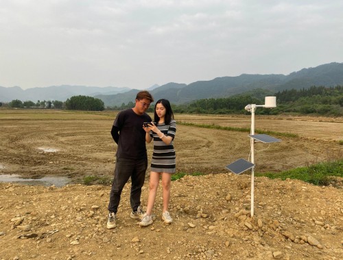 200亩高标准水稻田的管理者陈丽华与表弟在讨论春耕播种规划,地块部署了极飞农业物联网设备