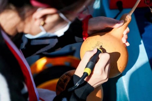 为增加活动的参与性和趣味性,现场特设了摄影作品展示区和互动体验区。观众在通过摄影作品领略云居寺独特的人文景观和自然风貌的同时,还可以体验茶道、古筝、投壶、香道等传统文化项目。尤其起源于汉代的烙画葫芦,在亲身感受其烙铁代笔“意在笔先、落笔成形”的艺术境界之时,不禁让人领悟到房山石经独特的以刻代笔“一锤一錾、铿锵斧斫”中积淀的中华千年文化的精神内涵。