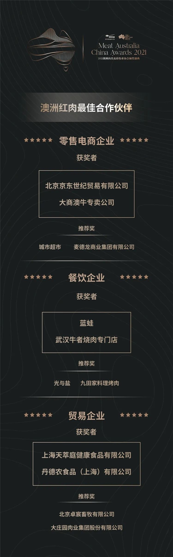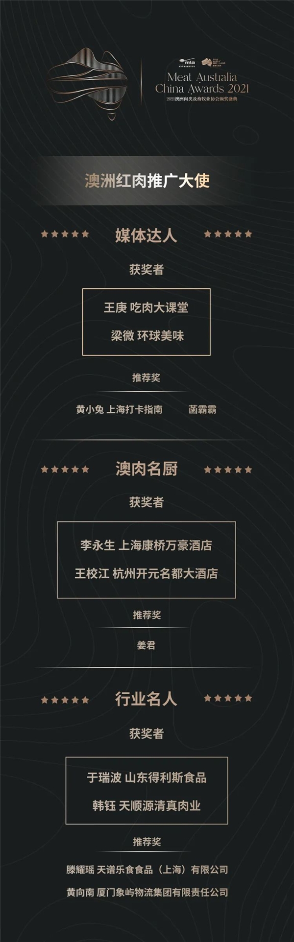 自3月10日评选启动,经过一个多月的报名和严格评选,本届Meat Australia China Awards 2021针对零售电商企业、餐饮企业、贸易企业、媒体达人、澳肉名厨、行业名人6大奖项的企业和个人进行表彰,共计产生了12个大奖获得者和11个推荐奖获得者。