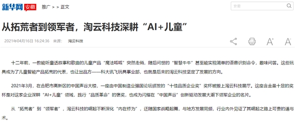 新华网以《从拓荒者到领军者,淘云科技深耕“AI+儿童”》为题,从深耕“AI+儿童”“等风来”、用品质对价格战说“NO”、初心是产业链的“长期价值”等三方面阐述淘云科技深化“内在修为”,随国家战略起舞,与地方发展同频,成为“AI+儿童”行业领军者的有益探索。