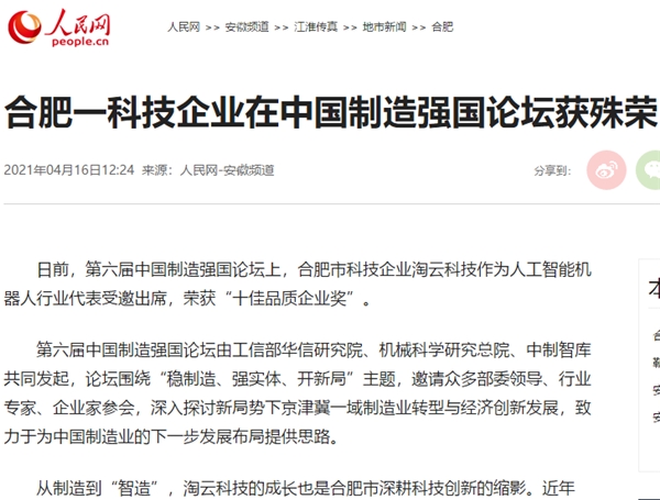 人民网发表《合肥一科技企业在中国制造强国论坛获殊荣》,报道了在第六届中国制造强国论坛上,淘云科技作为人工智能机器人行业代表受邀出席,荣获“十佳品质企业奖”。文中称,从制造到“智造”,淘云科技的成长是合肥市深耕科技创新的缩影。
