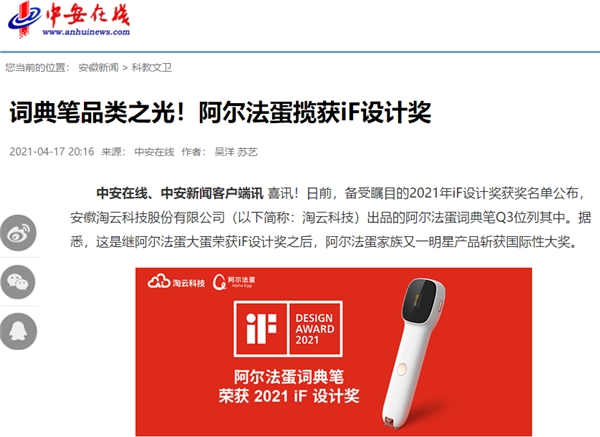 中安在线发表《词典笔品类之光!阿尔法蛋揽获iF设计奖》。文中称,阿尔法蛋词典笔Q3面向孩子的人体工学设计,机身更适合孩子抓握。它涵盖了20本中小学工具书,可查询68类知识点,集查译测听于一身。阿尔法蛋词典笔Q3采用了中高考口语测评同源技术引擎,还拥有出众的语音合成技术和文字识别技术。因此,阿尔法蛋词典笔Q3获得全球顶级工业设计奖项之一的德国iF设计奖,实至名归。