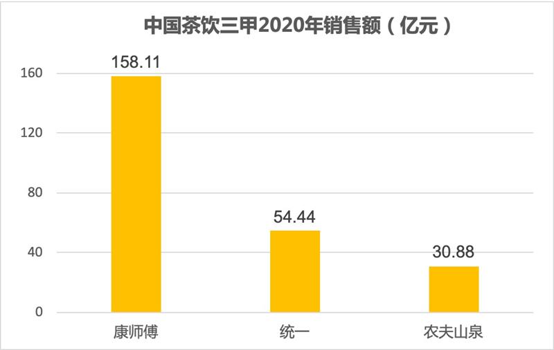 梳理2020年中国茶饮前三甲的营收规模,康师傅茶饮以158.11亿元处于绝对领先位置,相较第二名领先了100个亿不止。可以说,康师傅是当之无愧的“中国茶王”。