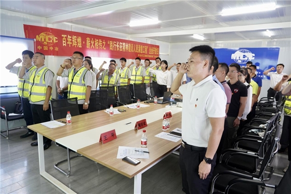 最后,项目负责人带领大家“走进”施工现场,以PPT形式对项目建设成果、特色亮点、农民工管理、BIM运用等情况进行展示,彰显项目建设中中冶天工集团精细化、技术化、安全化管理水平。讲解结束后,在项目施工现场开展“促进度 保工期 奋力大干30天”誓师大会,并现场建立一支以党员为主体,入党积极分子和优秀青年主动参与的党员突击队。项目负责人和业主代表为一线员工加油鼓劲、振奋士气,动员全体队员将“长征精神”落到实处,充分发挥突击队的先锋模范作用,克服困难、勇往直前,用突出的工作成效擦亮党员身份,用一流的工作业绩为党旗增辉,出色地完成各项任务,为建设自贸港贡献中冶力量。