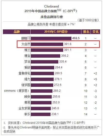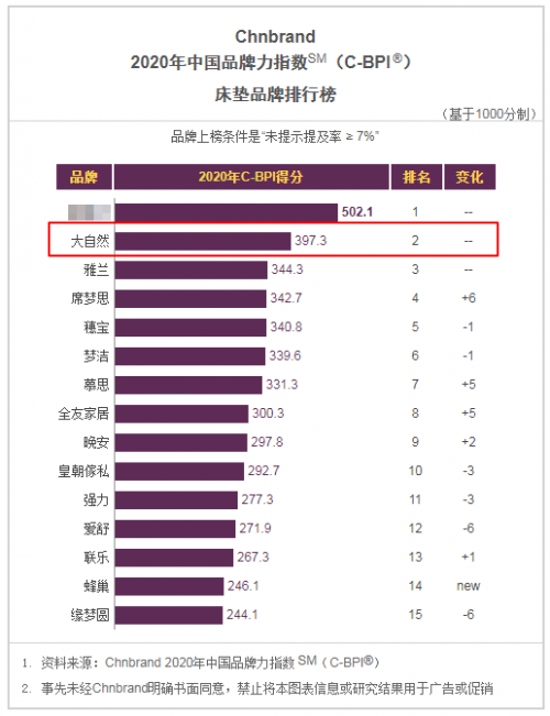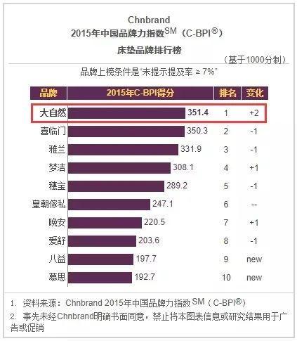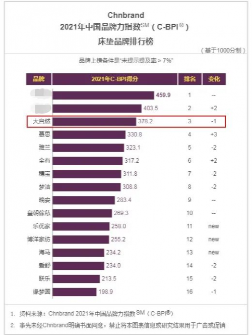 4月20日,2021年(第十一届)中国品牌力指数(C-BPI)品牌排名和分析报告在京发布,大自然床垫凭借在消费者群体中较高的品牌认知度、品牌忠诚度和品牌美誉度,荣登2021年“C-BPI中国床垫行业品牌榜第三”,连续8年蝉联国内床垫品牌前三名。