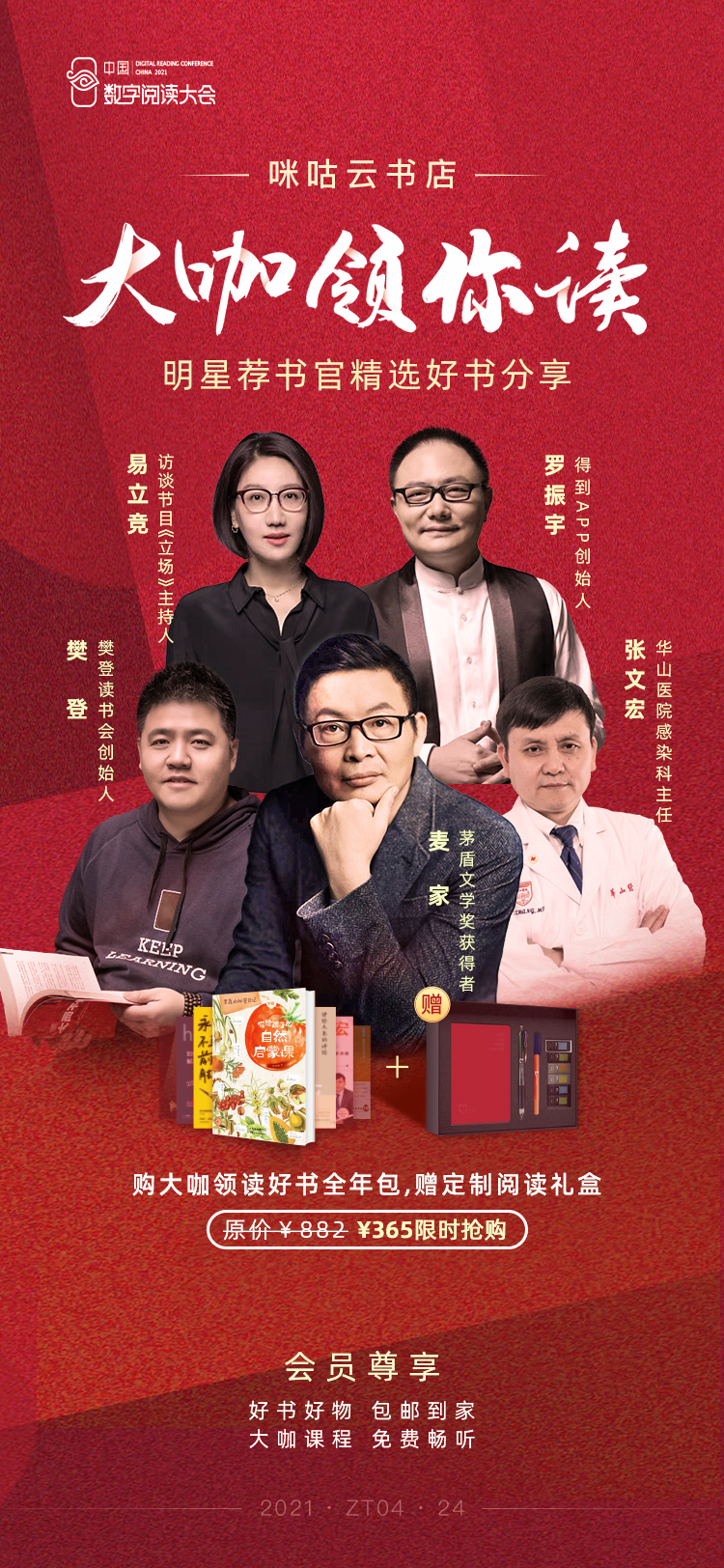 世界读书日期间,咪咕中信书店力邀麦家、樊登、罗振宇、易立竞、张文宏等12位名家大咖,作为专业荐书官在线领读,精选12本好书为读者打造“全年阅读计划”。广大读者除了可以在咪咕中信书店APP上在线购买之外,成为会员还能享受全站电子书免费读、大咖课程免费畅听等知识福利。
