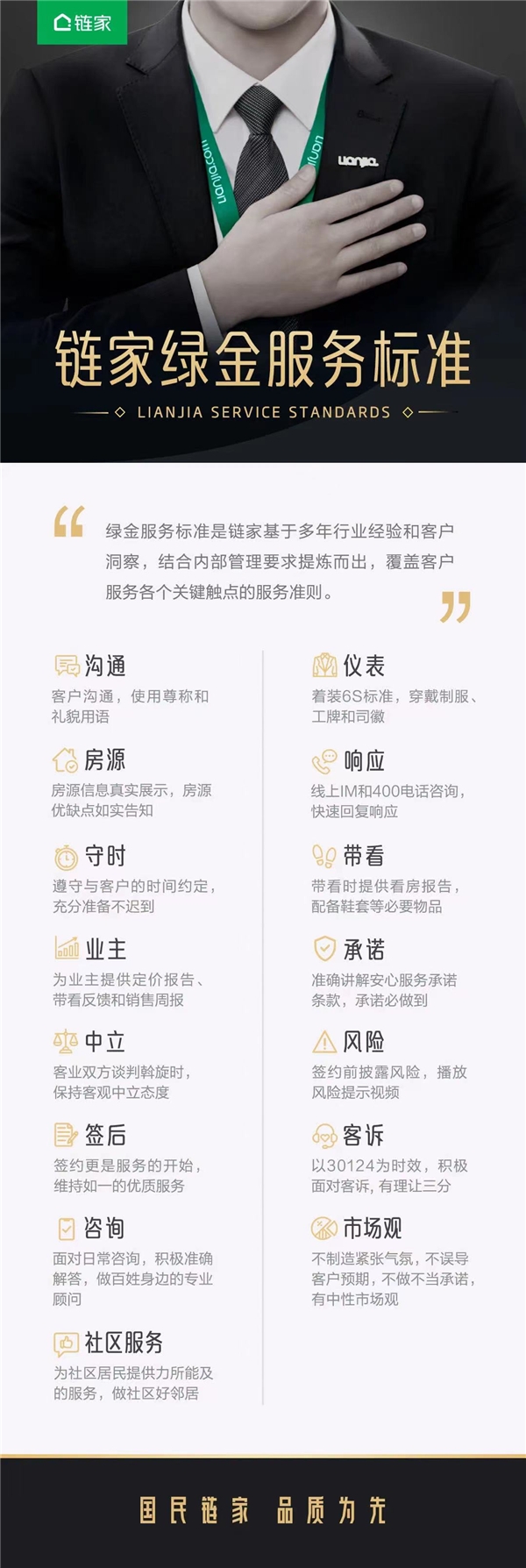 可在人与人强交互的中介服务中,制度层面的保障只是一方面,更重要的是,作为服务者的中介从业人员能够建立足够的“职业觉悟”,来自觉保持始终如一的服务。为此,链家在去年11月发布了规范房产经纪服务的15条“绿金服务标准”。作为经纪人的作业指导,“绿金服务标准”覆盖了签约前后的所有房产交易流程,其中也将“签后服务”写进标准之中,明确要求经纪人“签约也是服务的开始,维持如一的优质服务”。同时,链家还会通过持续的内部宣导来加强经纪人的认知。
