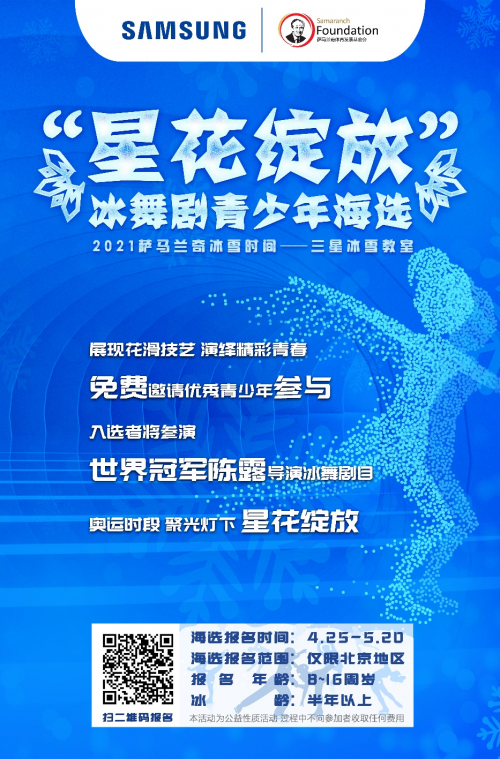 今年,项目进一步升级。中国三星将面向北京市8至16岁热爱花滑运动的青少年发出邀请,项目启动后开始为期近一个月的线上招募。报名达标参选人以就近为原则,在北京市五个活动指定冰场进行线下初选,由专业教练遴选出60名小学员进入终选。终选计划将于6月底进行,届时由世界冠军陈露及其他专业评委遴选出30名小学员,在其专业的培训和指导下完成以奥运冰雪为主题的青少年冰舞剧,作为三星青少年冰雪教室2021年项目成果。冰舞队拟于北京冬奥前夕或期间,作为北京大众冰雪运动爱好者进行汇报演出,届时将邀请国际奥委会以及中国三星等领导现场观看。