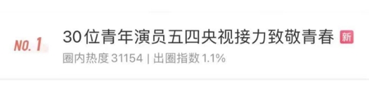 “最好的青春遇见你”融媒体主题行动登陆“CCTV电视剧”央视频、微博、抖音官方账号后立刻触发全网响应,新媒体平台的多方联动更掀起了“致敬青春”的热潮。截至5月4日24:00,相关话题总阅读量10亿,视频总播放量4074万,单条视频最高播放量1674万。话题#最好的青春遇见你#阅读量3.2亿,讨论量174.1万;话题#肖战感谢遇见你#阅读量2亿,讨论量62.1万; 话题#朱一龙叛逆者高燃台词##李现期待良乡#分别登上微博娱乐榜第5位和第11位,#30位青年演员五四央视接力致敬青春#更是登上了娱乐榜首位。央视频、共青团中央、中国消防、中国电影报、CCTV中国电视报、1905电影网官博等超百位蓝V进行转发。这次匠心独具的五四主题宣传,成为五一小长假期间颇受瞩目的一场融媒体主题行动。