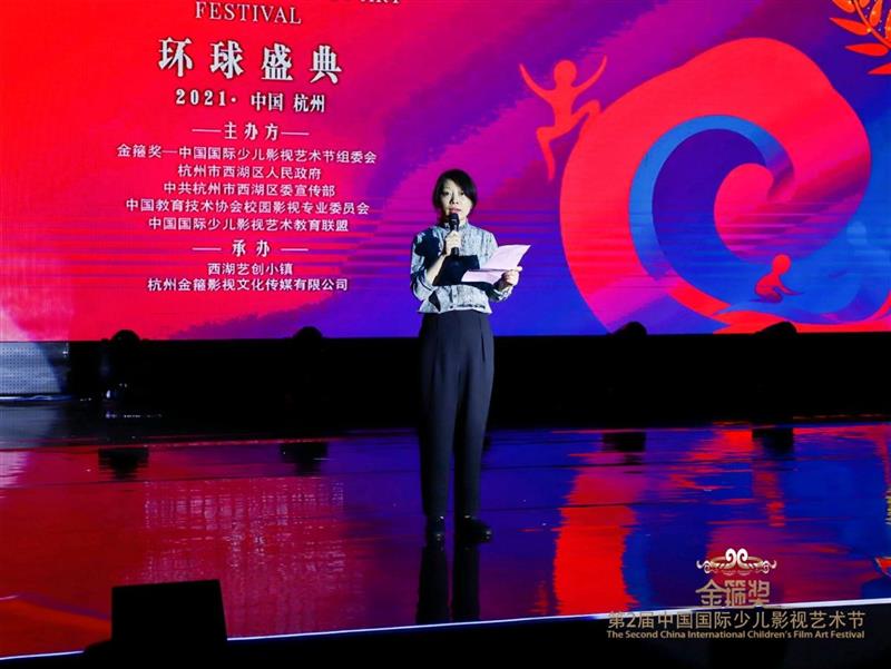西湖区人民政府副区长缪凌蓉女士现场致辞, 表达了对少年儿童艺术素质教育的关注,和对“金箍奖”的美好祝愿!