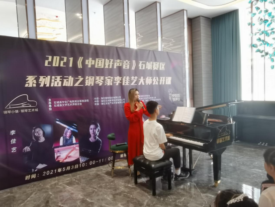 恰逢庆祝建党一百周年,身处江西革命根据地,切身受到先辈们英勇无畏精神的感染。青年钢琴家李佳艺更是放弃五一休假,于五月一日至五月四日千里迢迢的赶赴石城钢琴小镇,为老区的父老乡亲在《中国好声音》开幕式上登台献上了《黄河》《山丹丹花开红艳艳》两首充满激情的红色钢琴经典作品,并为当地的孩子们演讲了一场生动且不可多得的大师课。