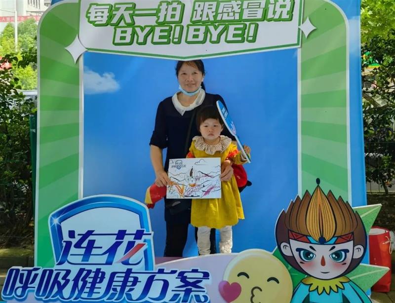 此外还有“每天一拍,跟感冒说BYE!BYE!”打卡拍照区,小朋友拿着画作,和家长一起拍照留念,画面温馨融洽。