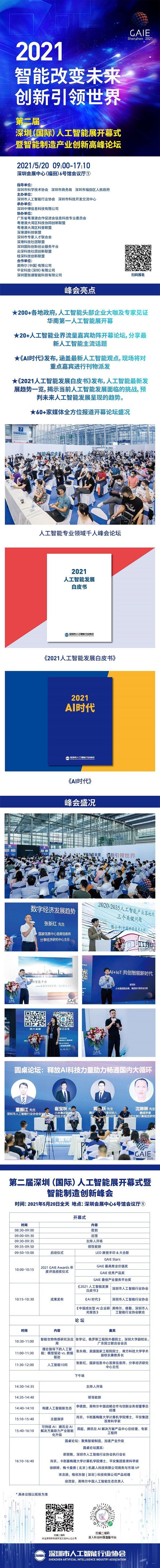 2021年5月20日,由深圳市科学技术协会、深圳市商务局作指导,深圳市人工智能行业协会、深圳市科技开发交流中心主办的2021第二届深圳(国际)人工智能展开幕式暨智能制造产业创新高峰论坛在深圳会展中心(福田)6号馆启幕,论坛以“智能改变未来,创新引领世界”为主题,邀请众多人工智能领域的专家学者以及AI代表企业高层对当下智能制造的技术难题、发展痛点以及未来展望进行深入探讨。论坛旨在推进信息化与工业化的深度融合及有效利用,推动智能制造实践,提升深圳市制造业的智能化水平,建立与政府沟通的渠道及科技创新、产业合作、人才培养的平台,提高深圳市的制造业竞争力,实现传统制造业转型升级。