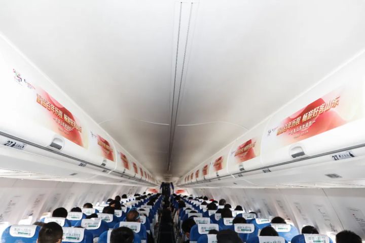 走进客舱,行李舱、迎宾壁板的装饰将大家带入天与云的翱翔中,一场红色文化旅行的飞行开始了。热情好客的山东不仅展现了自己丰富的红色文化旅游资源,还为在座的每一位旅客们准备了具有山东文化旅游特色的伴手礼,这份伴手礼中含有一份来自山东省文化和旅游厅的“山东有礼”系列文创产品——齐鲁“六好”文化旅游书签,让山东文化陪伴每一次阅读时光,好景、好趣、好味、好理、好品、好声,“好客山东”不负期待。